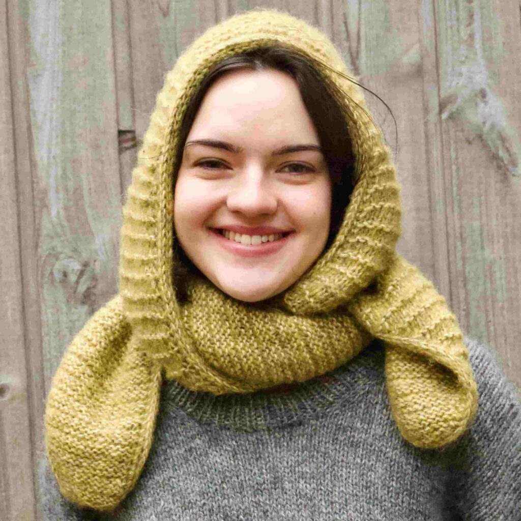 Marie Hoodie er en hue med tørklæde i et og samme stykke, der ud over at holde hovedet vamt også kan fungere som et halstørklæde.