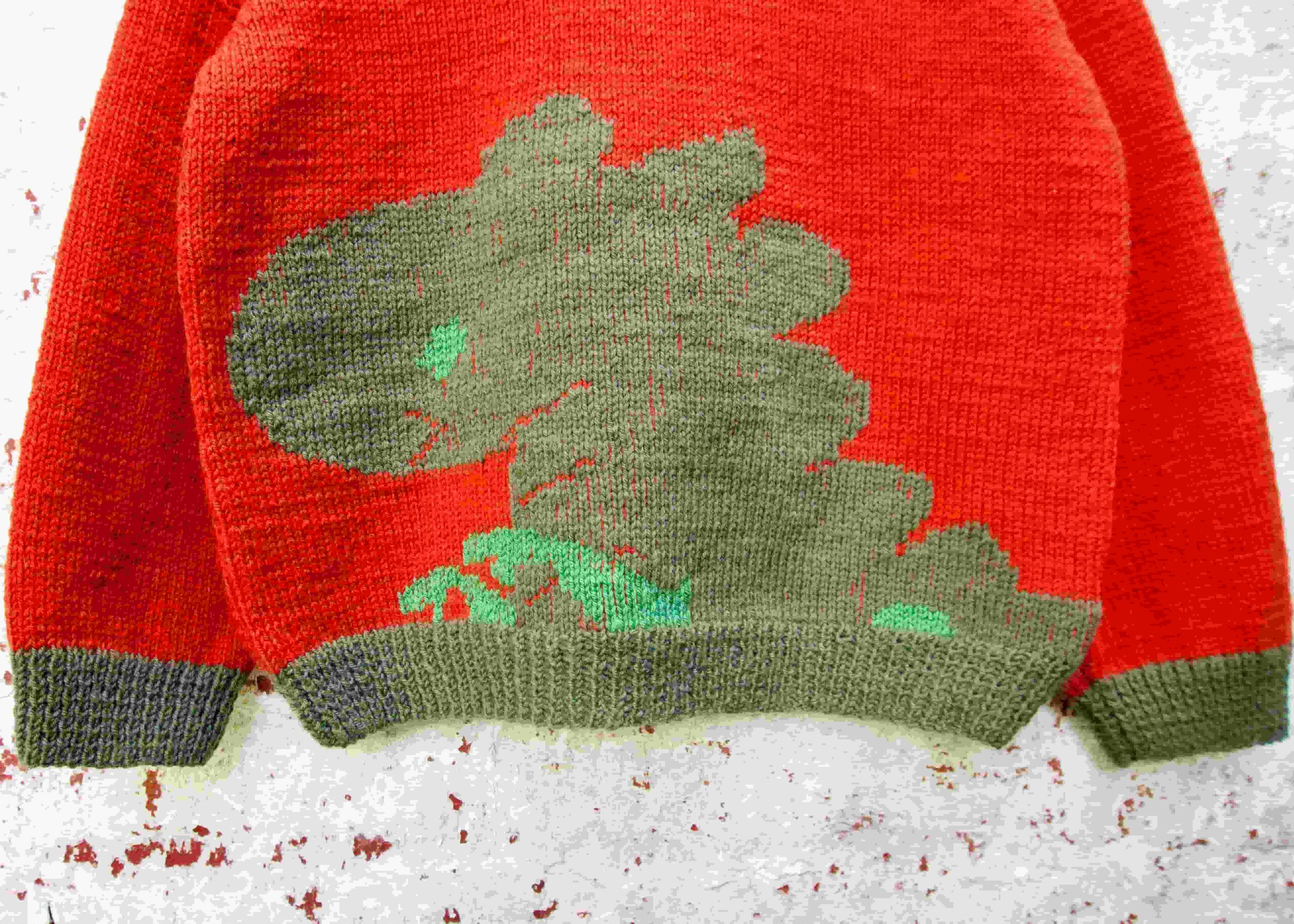 Barnebluse med Dinosauer designet af Karen-Maria Grau for Nordic Yarn Lab
