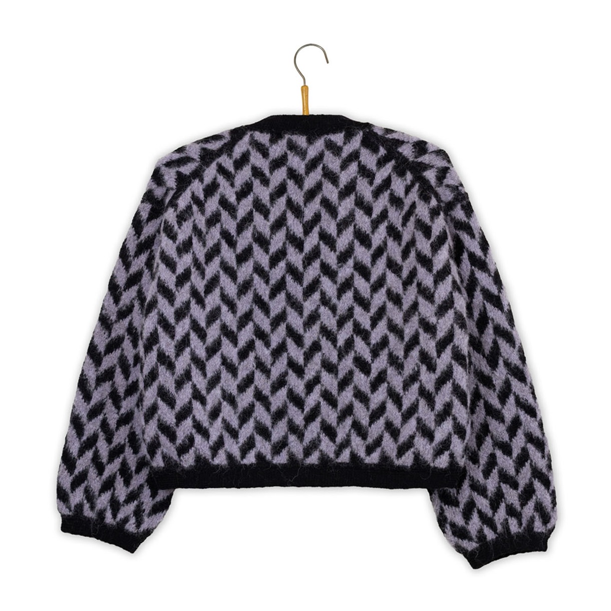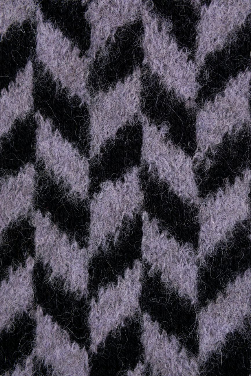 Billie Jean Jacket er en jakke med skrånende skuldersøm, dyb V-hals, lange ærmer og et markant tofarvet jacquardmønster.