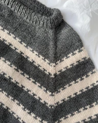 Den grå og hvide Key Sweater Man er strikket i Peer Gynt fra Sandnes Garn i farverne Charcoal melange [1065] og Almond [2511].