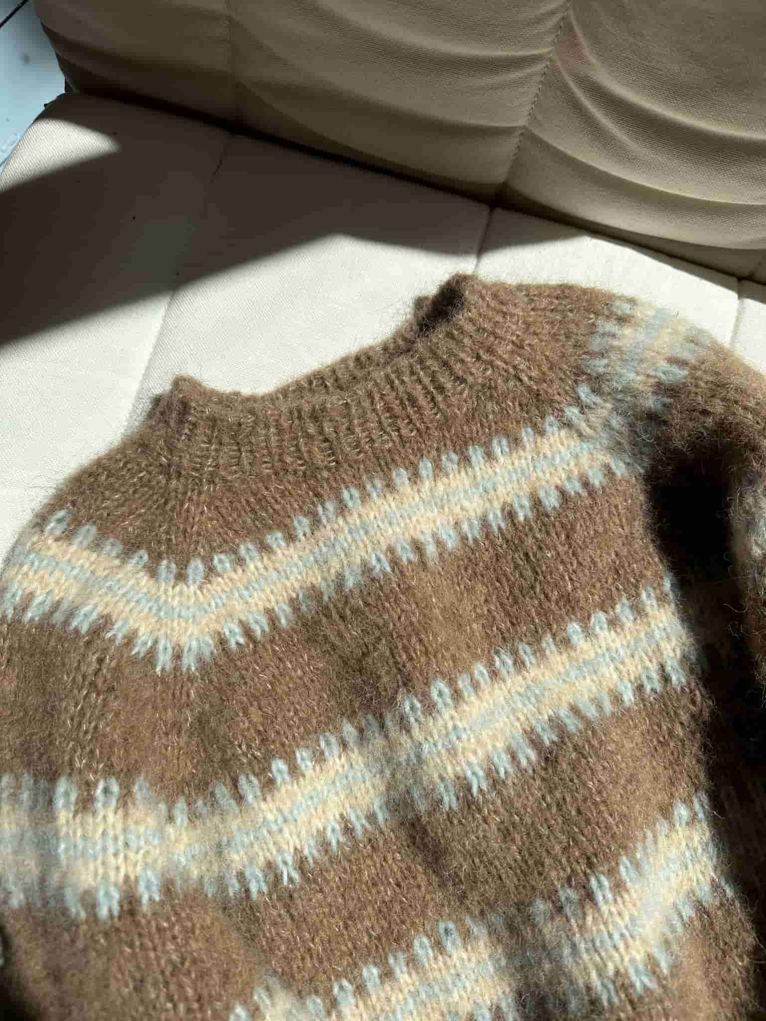 Den brune sweater er strikket i en kombination af Soft Fine og Soft.