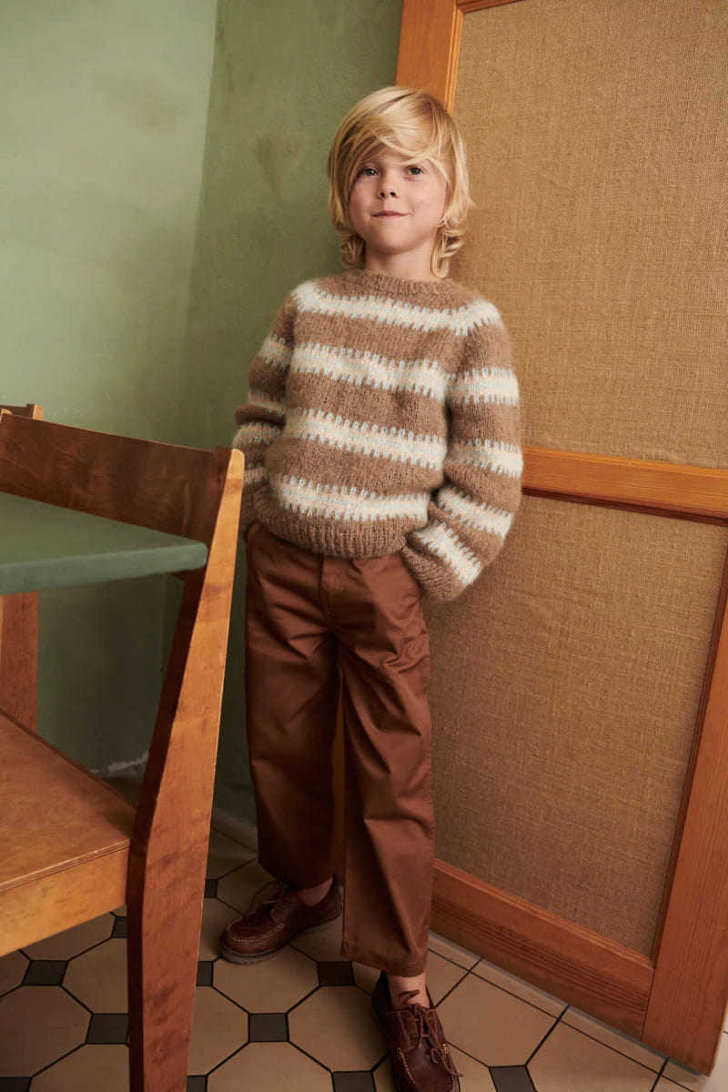 Little Norma Sweater er en klassisk raglantrøje med et tidløst design, der har et flot fald og en afslappet, løs pasform. Halsudskæringen formes med vendepinde efter ribkanten er strikket. Det enkle, men markante flerfarvede mønster fanger opmærksomheden og giver associationer til striktraditioner fra 60’erne og 70’erne. Sweateren strikkes oppefra og ned, hvilket gør det muligt at prøve den på undervejs.
